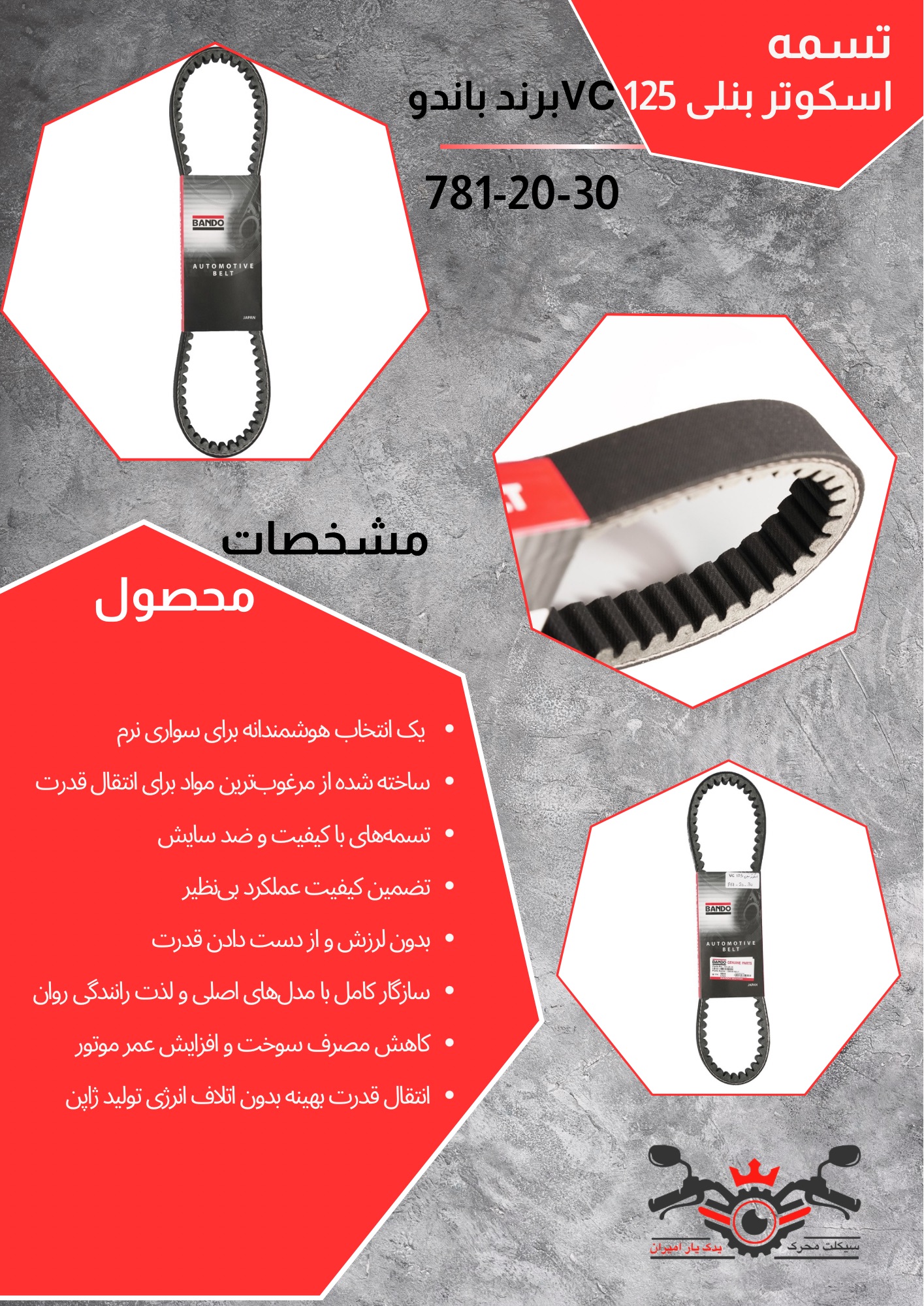 اگر به دنبال عملکردی بینقص و طول عمر بالا برای اسکوتر خود هستید، تسمه اسکوتر باندو مخصوص بنلی VC 125 بهترین انتخاب است. این تسمهها با استفاده از مرغوبترین مواد اولیه ژاپنی تولید شدهاند و انتقال قدرت را بدون هیچگونه لرزش یا اتلاف انرژی انجام میدهند.