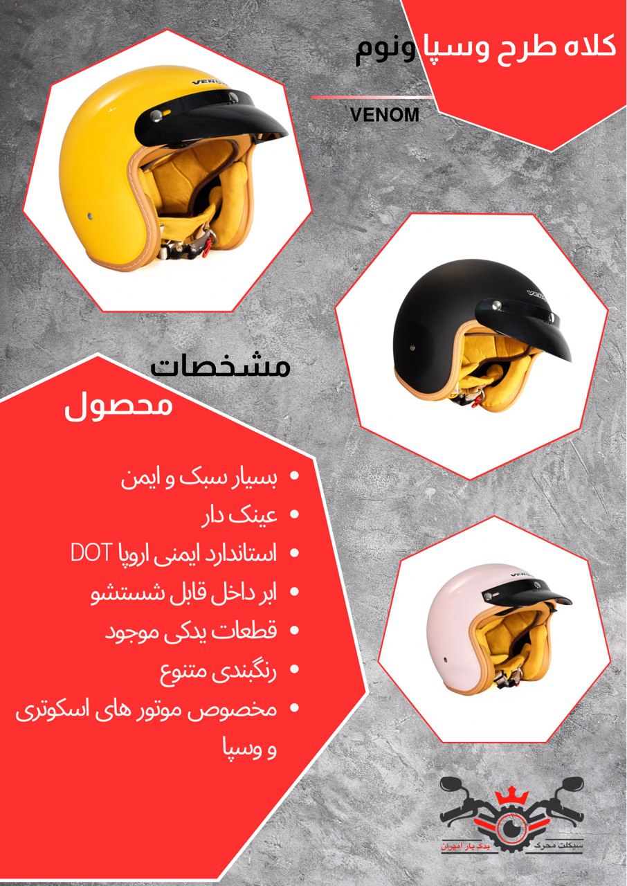 اگر بهدنبال یک کلاه کاسکت سبک، راحت و ایمن برای موتورهای اسکوتری یا وسپا هستید، کلاه ونوم طرح وسپا بهترین گزینه برای شماست. این کلاه با طراحی الهامگرفته از استایل کلاسیک وسپا و مجهز به امکانات کاربردی، تجربهای متفاوت از موتورسواری شهری را برایتان رقم میزند.